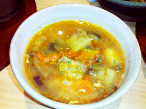 ※ビルマ汁とは、呉服店だった「もおかや」の先代飯塚潤一さんが、戦地のビルマ(現ミャンマー)で食べたスープ料理を、帰国後に再現したカレー風味のスープ。トマト、ナス、インゲンなど夏野菜を使い、和風だしとカレー、唐辛子で味付けする。